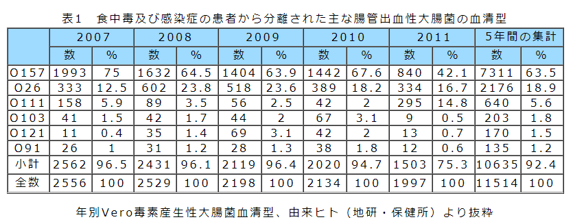 近年、わが国における食中毒及び感染症の患者から分離された主な腸管出血性大腸菌の血清型は、表1(国立感染症研究所:病原微生物情報から引用)に示したとおりO157、O26、O111などが挙げられています。これらの血清型による下痢症患者は、常に上位を占めており、感染した場合には、重篤な症状を示すことから、糞便や食品からの感染防止対策が重要視されています。